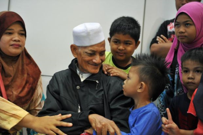Abdul Muluk, 71, yang kelihatan sihat, tersenyum lebar ketika bersalaman dengan anak cucunya di balai ketibaan Lapangan Terbang Antarabangsa Kuala Lumpur (KLIA).