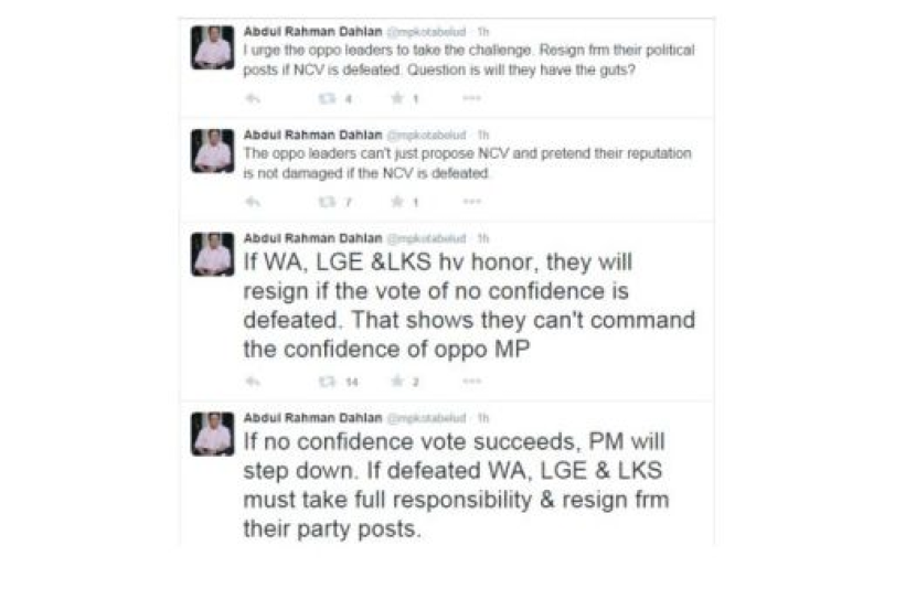 "Jika WA, LGCE & LKS mempunyai kehormatan, mereka akan meletakkan jawatan sekiranya undi tidak percaya gagal. Ia menunjukkan mereka tidak boleh mendapat kepercayaan sebagai ahli parlimen pembangkang," kata Abdul Rahman di Twitternya pada Khamis.