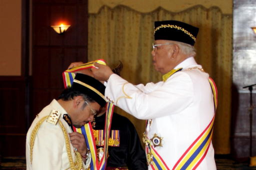Tun Mohd Khalil Yaakob menganugerahkan Darjah Cemerlang Melaka (DCSM) yang membawa gelaran Datuk Wira kepada Mustafar Ali sempena Ulangtahun Ke-77 Yang Dipertua Negeri Melaka di Seri Negeri pada Sabtu. Foto: Bernama
