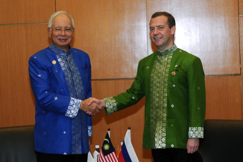 Najib berjabat tangan dengan Perdana Menteri Rusia, Dmitry Medvedev (kanan).