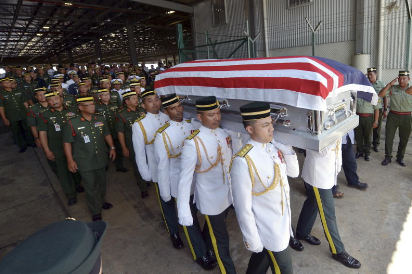 Keranda jenazah sebaluti bendera Malaysia disambut lebih 1,500 anggota dan pegawai Angkatan Tentera Malaysia (ATM).