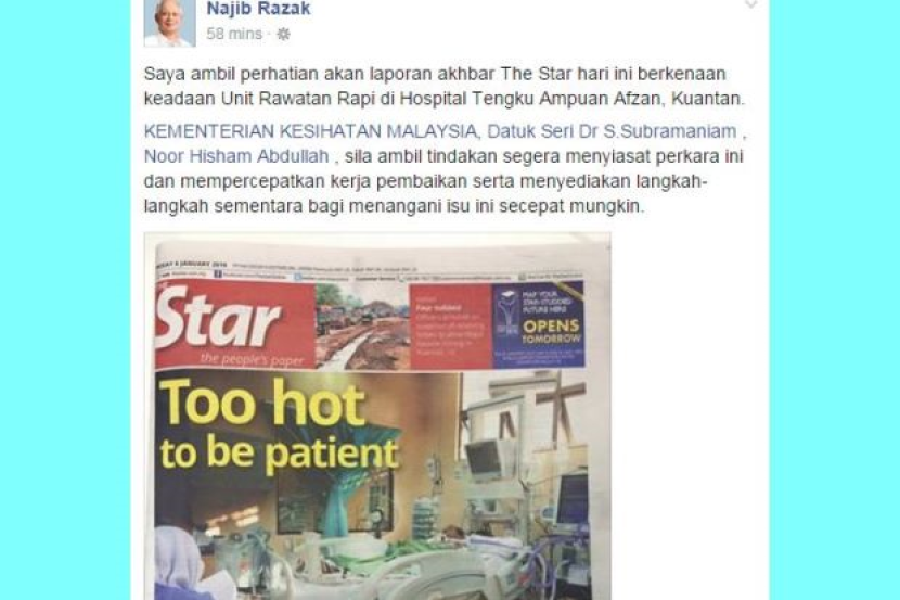 "Saya ambil perhatian akan laporan akhbar The Star hari ini berkenaan keadaan Unit Rawatan Rapi di Hospital Tengku Ampuan Afzan, Kuantan.