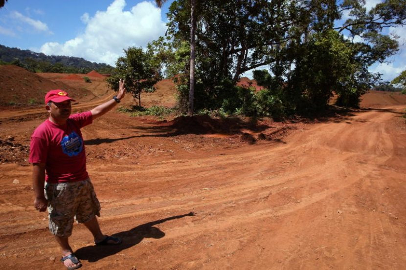MUSNAH... Kapten Dailyus Yusof menunjukkan kepada pihak media sebuah kawasan yang dahulunya adalah dusun durian kini telah habis diratakan untuk kegiatan perlombongan bauksit. -fotoBERNAMA