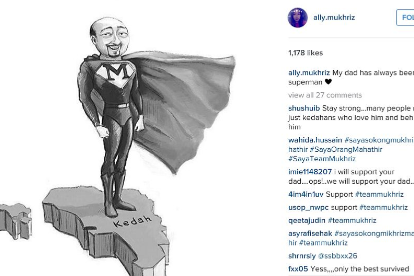 Beliau memuat naik gambar hitam putih dengan lakaran Mukhriz berdiri di atas peta negeri Kedah, berpakaian ala-Superman, watak adiwira yang dikenali ramai.