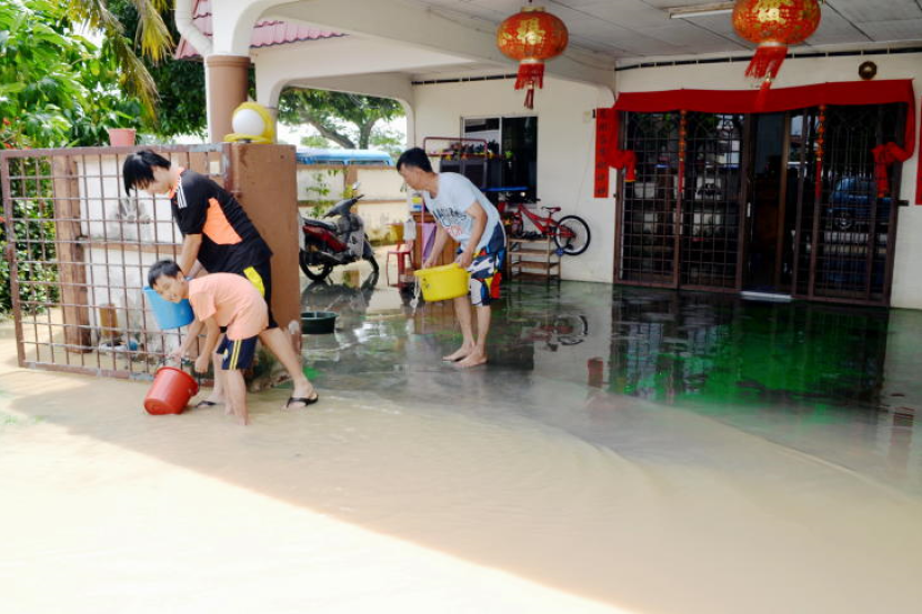 Mangsa banjir di Taman Merdeka Jaya, Batu Berendam yang akan menyambut Tahun Baharu Cina membersihkan kawasan rumah mereka yang dinaiki air. Foto: Bernama