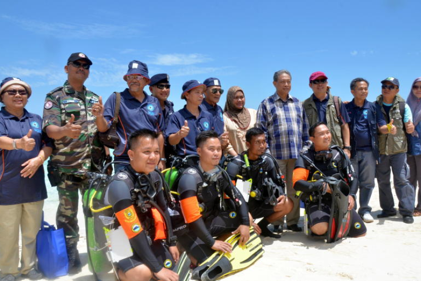 Empat Marsyal SelamanTaman Pulau Sipadan (duduk) bergambar bersama Setiausaha Tetap Kementerian Pelancongan, Kebudayaan dan Alam Sekitar Sabah, Datuk Ginun Yangus (lima, kiri) ketika pelancaran Pewartaan Perairan Taman Pulau Sipadan dan Marsyal Selaman di pulau itu pada Sabtu. Foto: Bernama