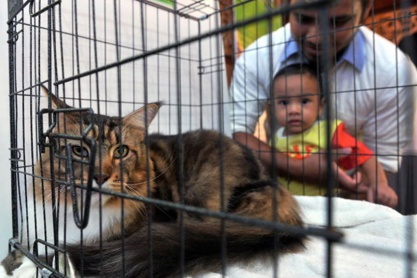 SI COMEL... Seorang pengunjung Muhamad Hafizi Yahaya, 29 membawa anaknya Muhammad Aqil Qaizer, 1, melihat pelbagai spesis kucing pada Pameran Kucing Antarabangsa di Kompleks Kraf. -fotoBERNAMA
