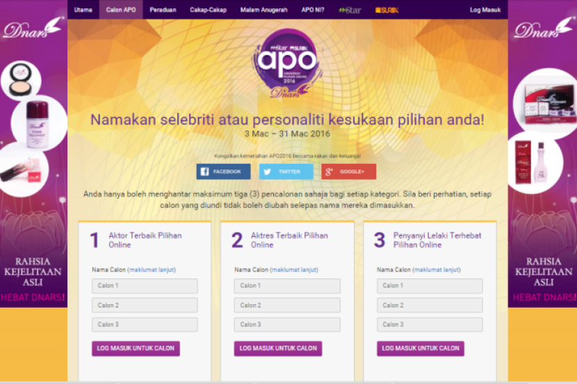 Pengguna media sosial boleh membuat pencalonan menggunakan tiga log masuk berbeza merangkumi Facebook, Twitter atau Google.