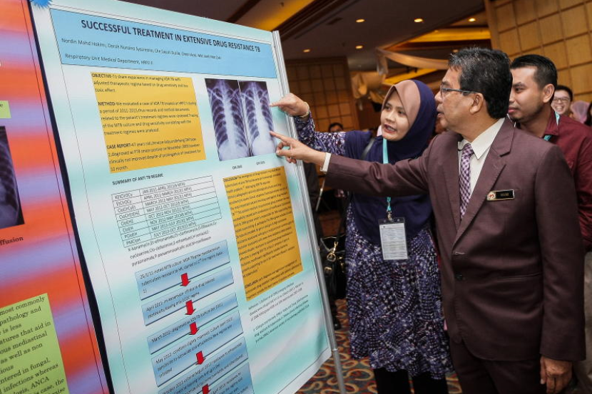 Dr Hilmi Yahaya (kanan) mendengar penerangan Pakar Perubatan Respiratori Hospital Raja Perempuan Zainab 2 Kota Bharu, Dr Azza Omar (dua, kanan) pada Persidangan Tuberkulosis dan Penyakit Paru-paru Negara pada Sabtu. Foto: Bernama