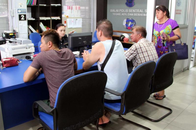 Bapa mangsa culik Wong Teck Kang dan Wong Teck Chii (dua kanan) serta ahli keluarga membuat laporan di Balai Polis Sentral, Sibu.