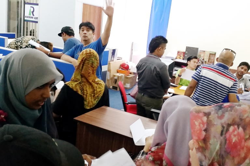 Bagi yang bernasib baik, mereka dapat duduk di kerusi dan meja untuk mengisi borang dalam pejabat Rayani Air bersaiz kecil itu, manakala yang lain terpaksa berpuas hati dengan lantai simen di luar pejabat yang terletak di tingkat dua bangunan.