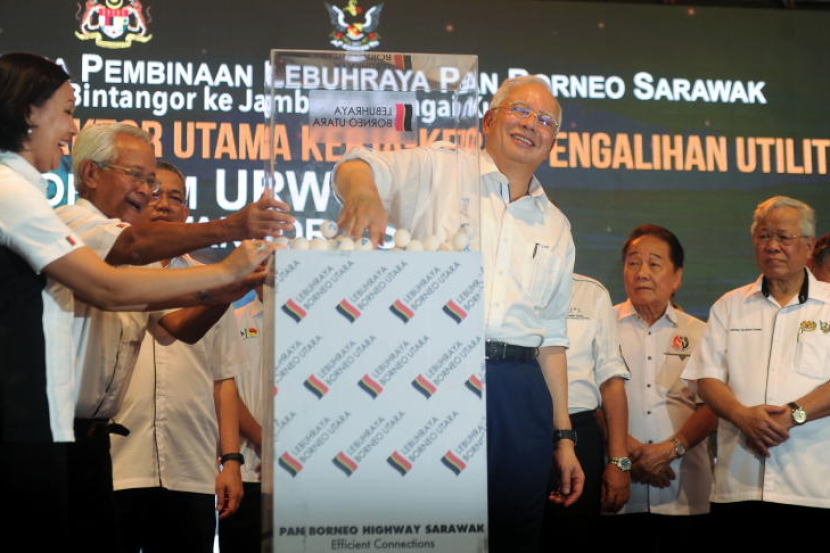 Najib mencabut undi kontraktor selepas merasmikan Lebuhraya Pan Borneo Sarawak jajaran Simpang Bintangor ke Jambatan Sungai Kua, Ahad. Foto Bernama