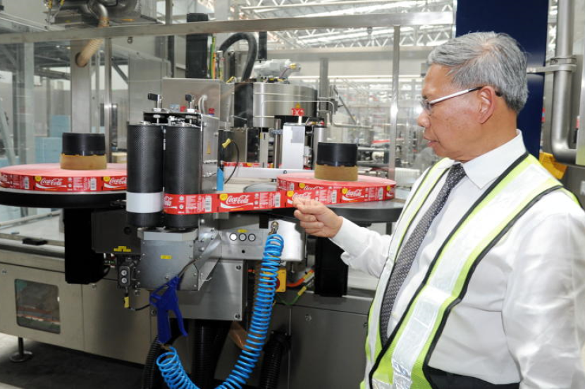 Mustapa Mohamed melihat mesin pengeluaran pada Majlis Pelancaran Rantaian Pengeluaran Baru Coca-Cola Bottlers (Malaysia) Sdn Bhd di Taman Perindustrian Halal pada Rabu. Foto:Bernama