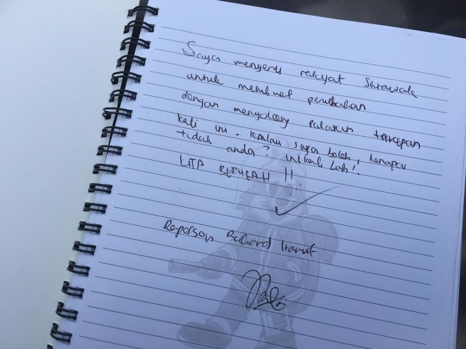 Di tengah rimba dan kegelapan malam, calon istimewa ini nyata tidak melupakan pengundi kawasan yang ditandinginya apabila menitipkan nota khas buat mereka.