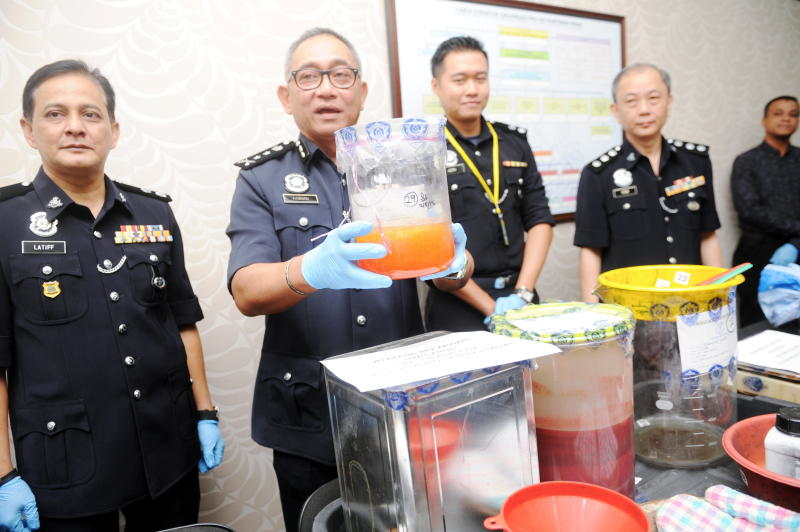 "Polis menemukan dadah jenis methamphetamine seberat empat kilogram (kg) dan cecair methamphetamine seberat 11.9 kg serta peralatan dipercayai untuk kegunaan memproses dadah antaranya dapur elektronik, bekas silinder kaca, penimbang digital, kabel elektrik bersama suis dan plug serta sarung tangan.