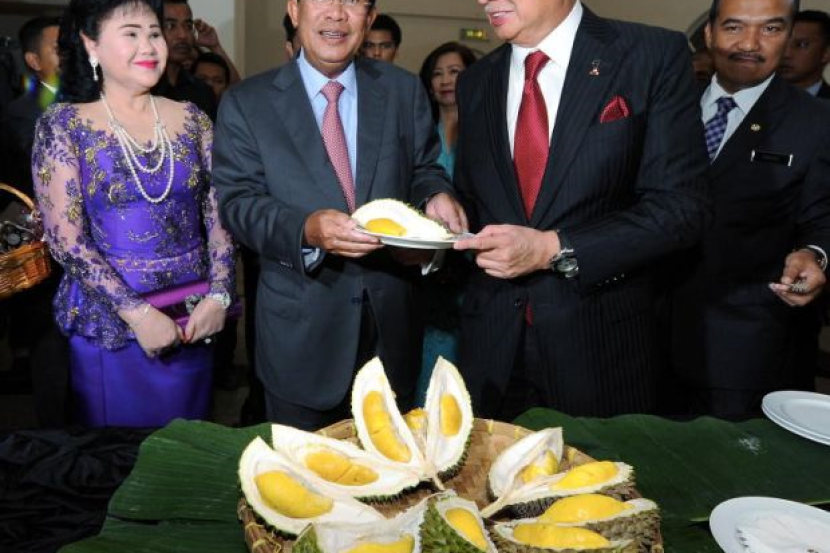 Najib memperkenal dan menerangkan mengenai buah-buahaan itu kepada Hun Sen dan isteri.