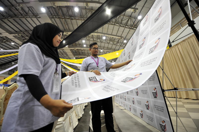 Dua Petugas pilihanraya Wan Samsuhaida Samsudin (kiri) dan Halizul Abd Halim membuat persiapan akhir di Pusat Penamaan Calon Pilihanraya Kecil (PRK) Kuala Kangsar di Dewan Jubli Perak hari ini.