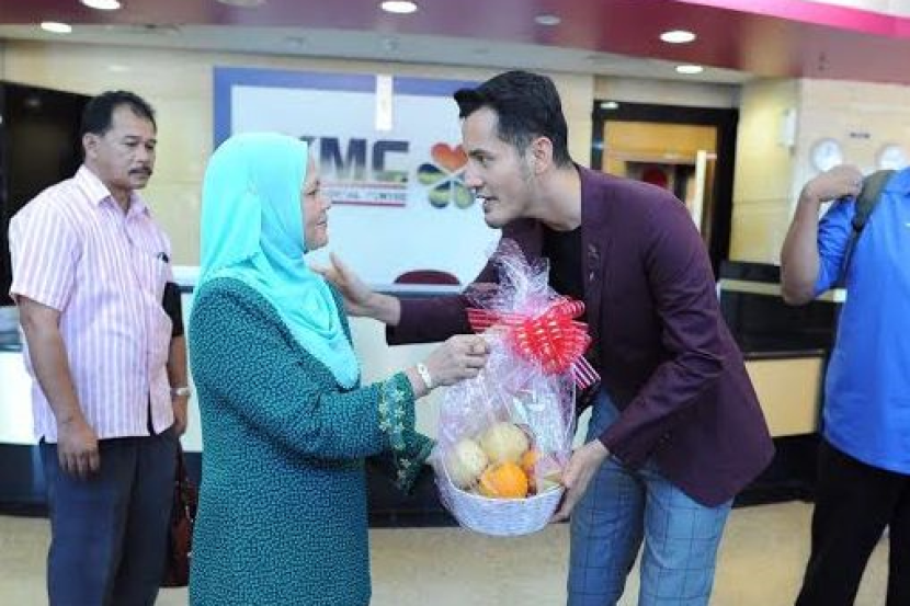 Aliff Syukri menyampaikan buah tangan kepada Datin Seri Hizam Awang Ahmad.