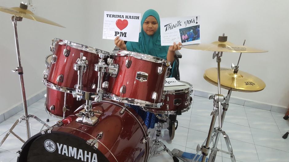 “Ecah kata dia nak cuba belajar main drum dan hari ini, mewakili perdana menteri kita hantar drum ini untuk memberi sokongan dan semangat kepada minatnya itu,” katanya.
