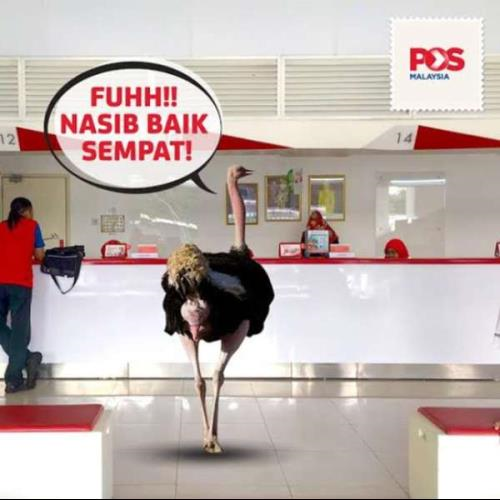 Dalam iklan itu memaparkan seekor burung unta berada hadapan kaunter Pos Malaysia dengan kapsyen “Fuhh, nasib baik sempat.”