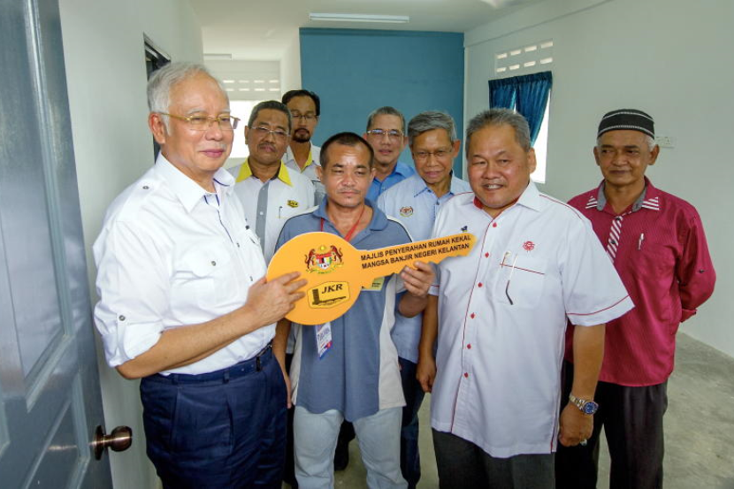Najib menyerahkan replika kunci kepada Che Wan Saat, 66, pada majlis penyerahan kunci rumah kekal baharu (RKB) mangsa banjir di Kampung Staponal Batu Jong di kawasan Dewan Undangan Negeri Mengkebang sempena lawatan kerja beliau ke Kelantan, Ahad. -fotoBERNAMA