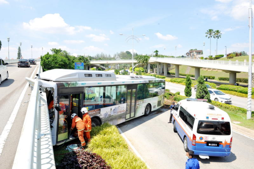 PUTRAJAYA: Pemandu bas cedera apabila bas yang dipandunya terbabas dan merempuh jejambat di Lebuh Perdana Barat, Presint 1 berhampiran Bangunan Perdana Putra di sini tengah hari Selasa.
