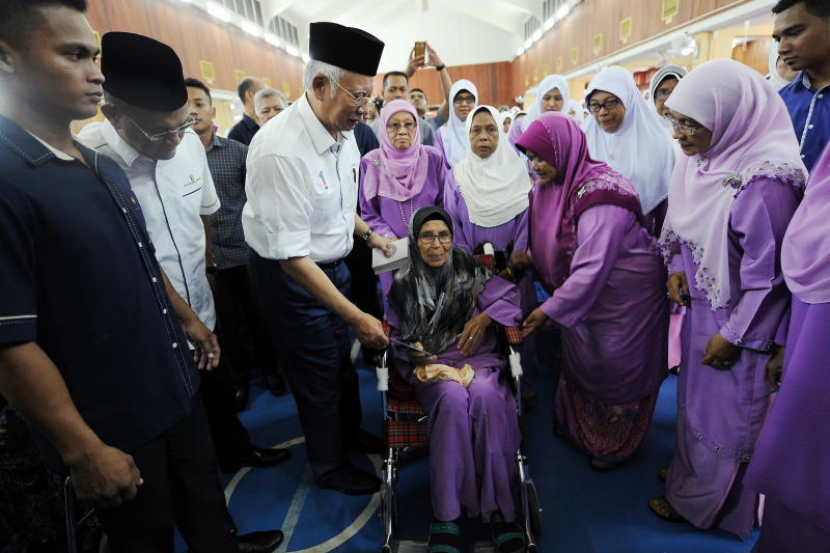 Najib Tun Razak (tiga, kiri) menyampaikan zakat kepada ibu tunggal Kamaruah Mat Saleeh, 83, yang berkerusi roda ketika majlis Penyampaian Zakat kepada Ibu Tunggal Parlimen Pekan, Ahad.Foto: Bernama