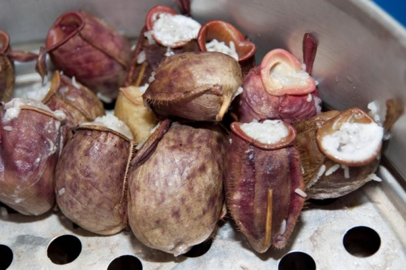 "Lemang periuk kera ini kena kukus bukan bakar macam lemang biasa dalam buluh ini. Mula-mula kita masukkan pulut dalam kelongsong periuk kera ini kemudian baru kita tuangkan santan di atas pulut sebelum dikukus.
