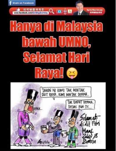 Selain itu mengikut akaun Facebook yang bernama Nga Kor Ming, satu status yang dimuat naik pada 5.15 petang 6 Julai, yang bertajuk "Hanya di Malaysia di bawah Umno, Selamat Hari Raya", satu karikatur menunjukkan dua budak sedang meminta derma daripada seorang individu.