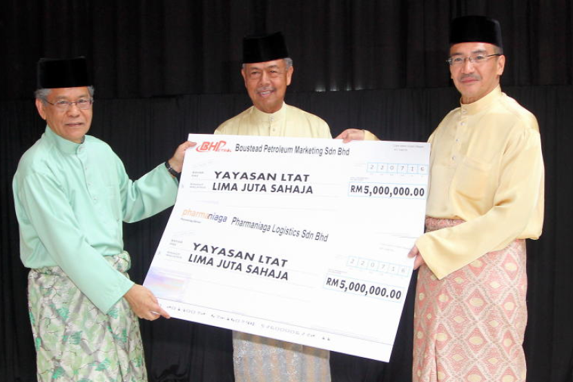 Hishammuddin TUn Hussein (kanan) menerima replika cek daripada Pengerusi Boustead Holdings Berhad dan Pharmaniaga Logistics Sdn Bhd, Tan Sri Lodin Wok Kamaruddin (kiri) untuk diserahkan kepada Pengerusi LTAT, Tan Sri Mohd Anwar Mohd Nor (tengah) ketika Majlis Ramah Mesra Aidilfitri LTAT bersama menteri pada Jumaat. Foto: Bernama