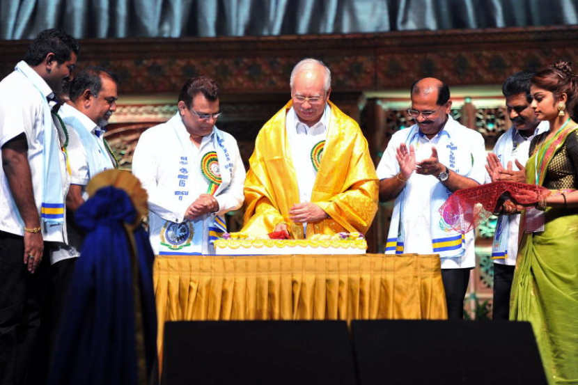 Najib Tun Razak memotong kek ulang tahun kelahiran beliau sempena sambutan Jubli Intan dan Persidangan Kongu Antarabangsa di Stadium Negara hari ini. Turut hadir Penasihat Kementerian Pengangkutan Tan Sri M Kayveas (tiga, kiri) dan Presiden Persatuan Kebajikan Namakkal Malaysia Datuk K. Subramaniam (tiga, kanan) Ketua Deligasi Luar Negara Komuniti Kongu, ER Eswaran (dua, kiri). Foto:Bernama
