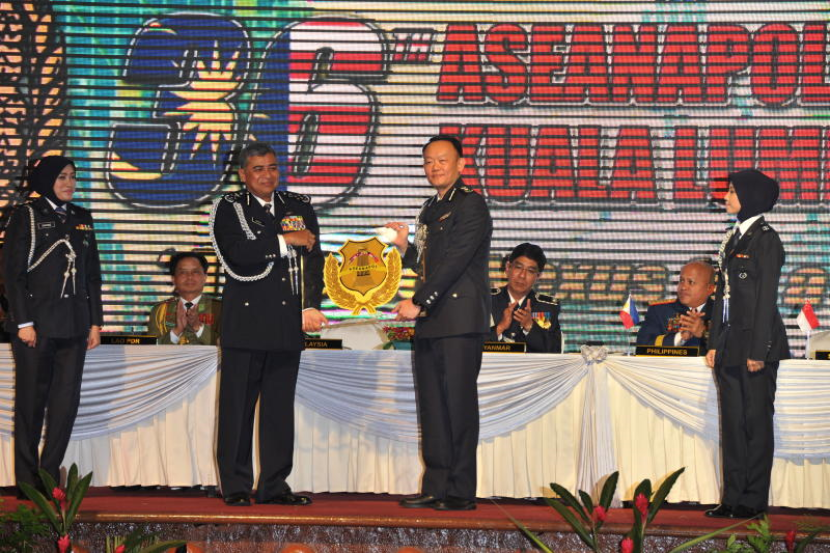Khalid Abu Bakar menyerahkan lencana Polis ASEAN (ASEANPOL) kepada Pesuruhjaya Polis Hoong Wee Teck simbolik penyerahan penganjuran Persidangan ASEANPOL Ke-37 di Singapura sempena Majlis Penutup Persidangan ASEANPOL Ke-36 pada Khamis. Foto: Bernama