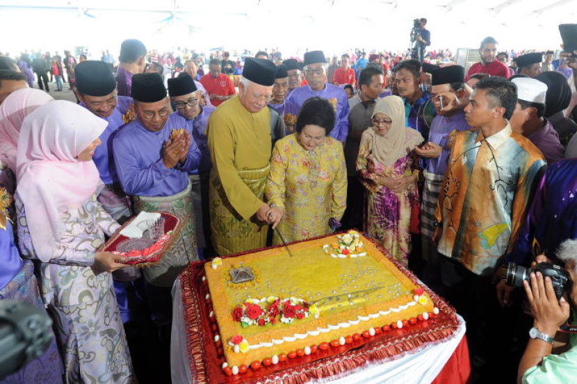 Najib Tun Razak bersama isteri Datin Seri Rosmah Mansor memotong pulut kuning sempena harijadi Perdana Menteri pada majlis Sambutan Rumah Terbuka Aidilfitri Parlimen Pekan 2016 di Taman Tasik Sultan Abu Bakar pada Sabtu. Foto: Bernama