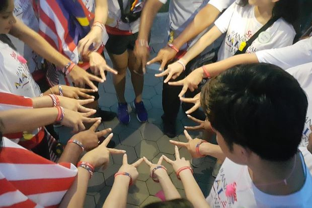 Memakai jalur pergelangan tangan #AnakAnakMalaysia, sekumpulan peserta dilihat mengambil gambar wefie sementara menunggu acara bermula.