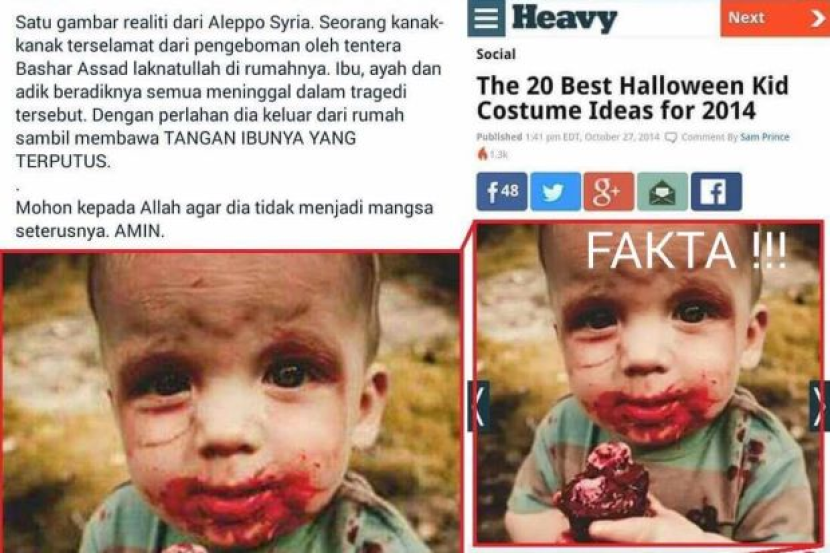 Realitinya, kanak-kanak lelaki dalam gambar tersebut bukan berasal dari Syria tetapi dari Amerika Syarikat yang mulutnya disolek dengan warna merah dan membawa tangan palsu untuk sambutan Halloween.