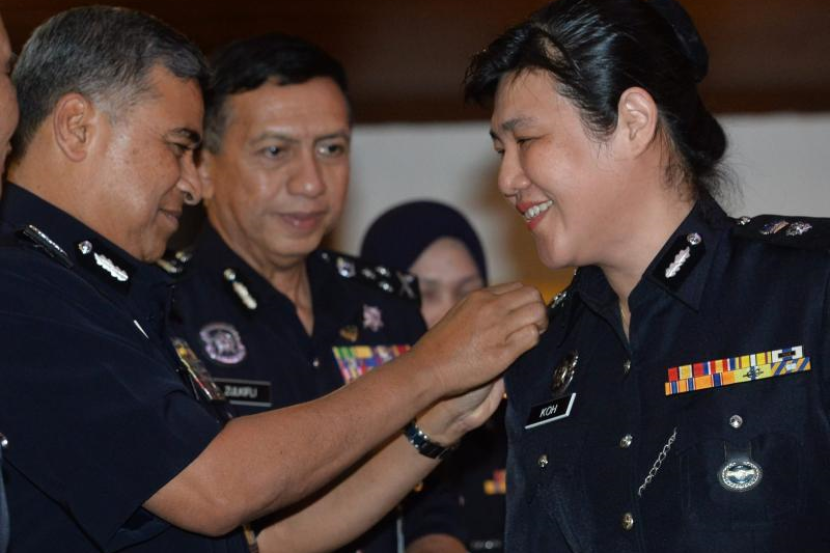 Khalid memakaikan lencana pangkat kepada pengawai kanan, Koh Seok Keng pada majlis Pemakaian Lencana Pangkat Pegawai Kanan Polis Diraja Malaysia di Bukit Aman pada Jumaat.