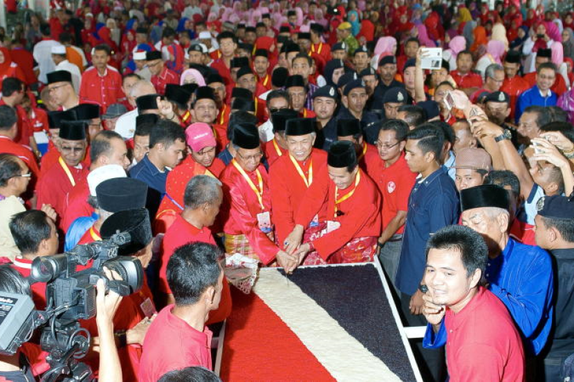 Dr Ahmad Zahid Hamidi memotong pulut gergasi ketika merasmikan Mesyuarat Perwakilan UMNO Bahagian Rantau Panjang di Kolej Kemahiran Tinggi Mara Lubok Jong pada Jumaat. Foto: Bernama