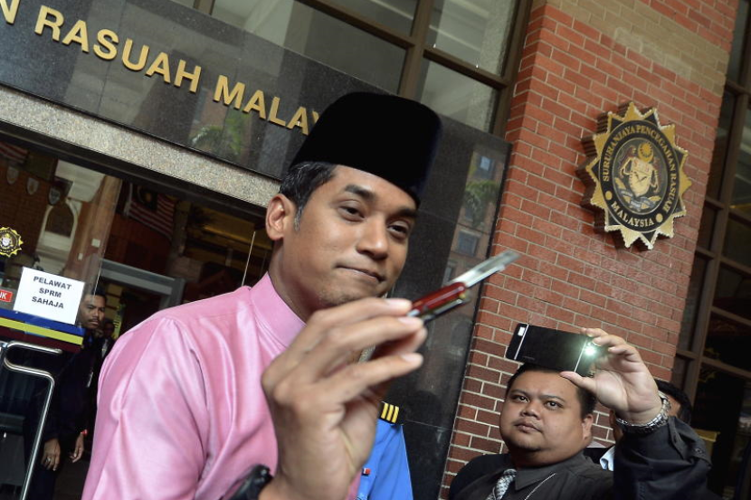Khairy menunjukkan pemacu pena sebelum menyerahkannya kepada SPRM pada Jumaat.