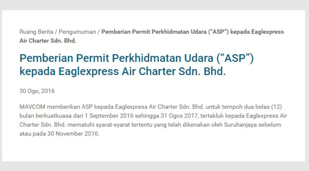 Selain ASP yang dikeluarkan Mavcom, Sijil Operator Udara (AOC) milik Eaglexpress turut diperbaharui Jabatan Penerbangan Awam (DCA) pada minggu lalu.