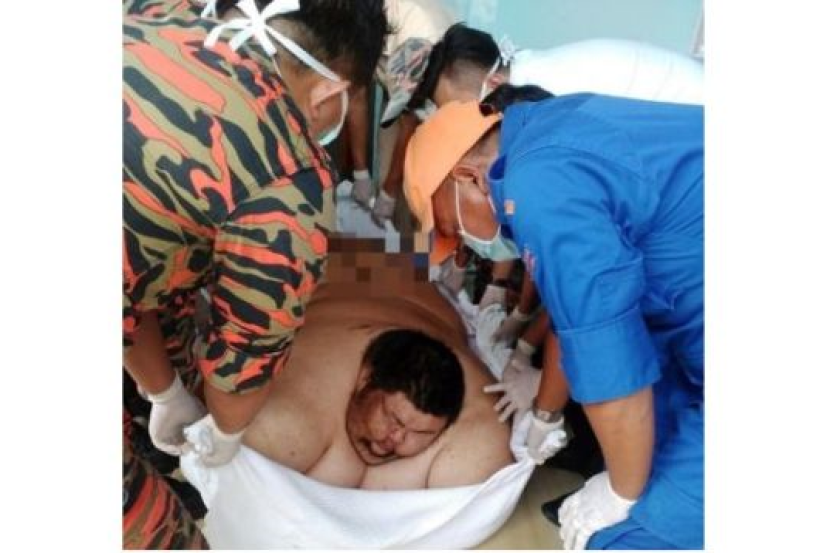 SIBU: Empat anggota paramedik yang tiba dengan ambulans terpaksa meminta bantuan Jabatan Bomba dan Penyelamat serta Jabatan Pertahanan Awam Malaysia (JPAM) untuk membawa seorang lelaki obesiti ke hospital, Rabu.