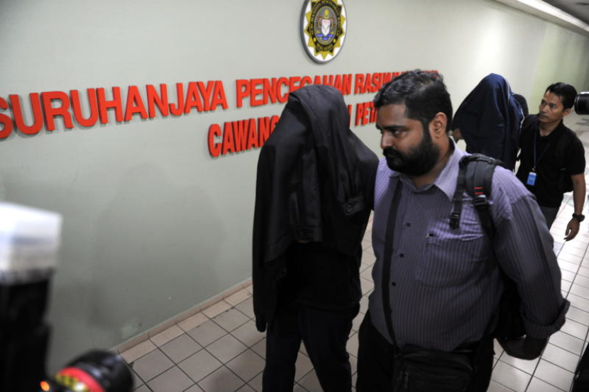 Dua orang suspek yang merupakan pembantu penguatkuasa JPJ diiring oleh pegawai SPRM bagi membantu siasatan berhubung kes rasuah di Ibu Pejabat SPRM di Sungai Petani pada 22 September 2016.- BERNAMA
