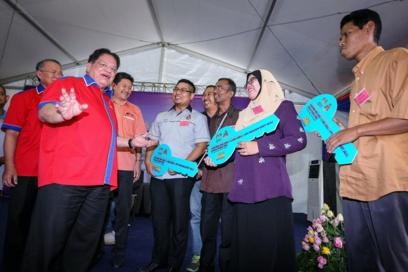 Tengku Adnan Tengku Mansor (dua, kiri) beramah mesra dengan para penerima kunci Apartmen Seri Ceria 1 dan 2 pada majlis penyerahan kunci kepada warga Dewan Bandaraya Kuala Lumpur pada Sabtu. -fotoBERNAMA