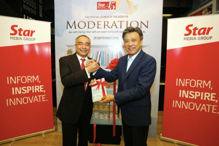 Datuk Seri Wong Chun Wai menyampaikan cenderahati buku Moderation kepada Datuk Seri Nazir Razak yang melancarkan naskhah khas itu di Menara Star, Khamis.