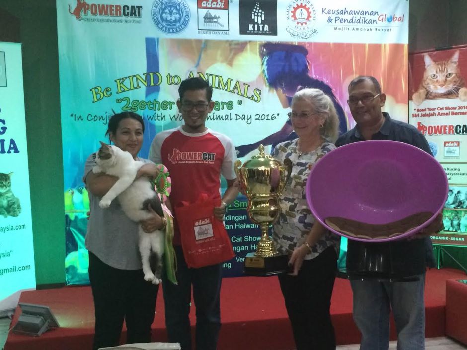 Wan Muhaizan (kanan) bersama juri dari Australia, Mare (dua dari kanan), wakil penaja dan Presiden KKM, Khalid Rashid pada majlis penyampaian hadiah pertandingan kucing di Medan Mara, Sabtu.