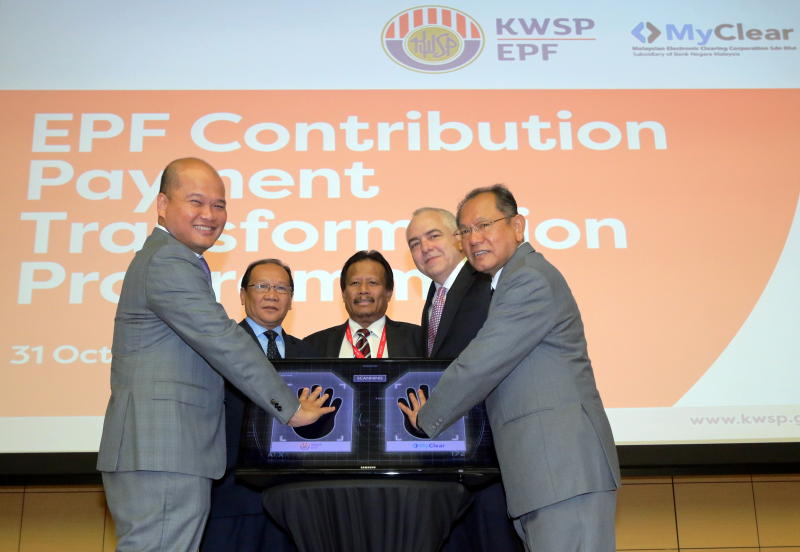 Ketua Pegawai Eksekutif Kumpulan Wang Simpanan Pekerja (KWSP) Datuk Shahril Ridza Ridzuan (kiri) bersama Pengerusi MyClear dan Komunikasi dan Multimedia Malaysia Datuk Seri Halim Shafie (kanan) merasmikan Program Transformasi Bayaran Caruman melalui e-Caruman di Sasana Kijang Bank Negara Malaysia hari ini. Turut hadir Timbalan Ketua Pegawai Eksekutif (Bahagian Operasi) KWSP Datuk Mohd. Naim Daruwish (dua, kiri), Pengarah Urusan MyClear Peter Schiesser (dua, kanan) dan Ketua Jabatan Caruman KWSP Azmi Awang (tengah).