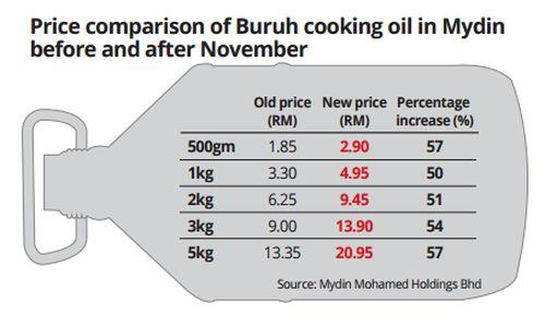Bagi minyak masak dalam botol lima kilogram, ia menyaksikan peningkatan harga sehingga 60 peratus.