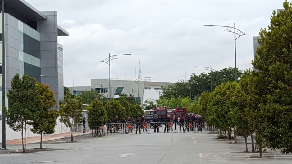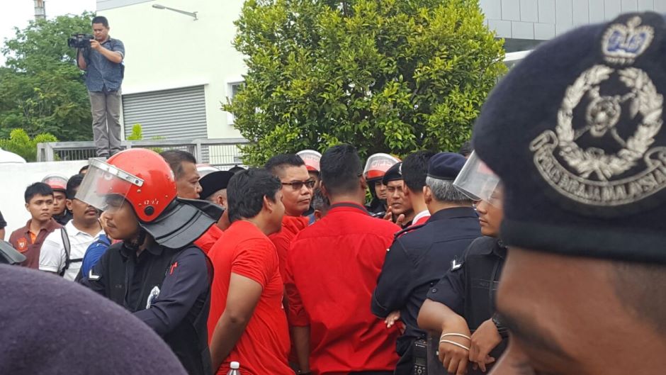 4 ptg: Kumpulan Baju Merah tiba di hadapan pejabat Malaysiakini tetapi bangunan itu dikawal ketat oleh anggota FRU.