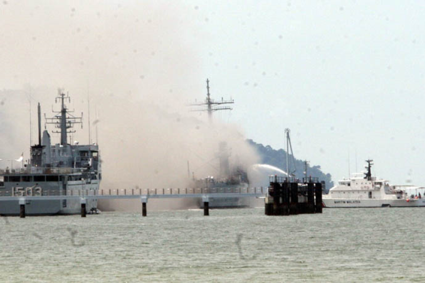 LUMUT: Pangkalan Tentera Laut Diraja Malaysia (TLDM) Lumut gempar apabila sebuah kapal ronda KD Kelantan 'terbakar' dan menyebabkan 26 anggota terperangkap pagi Khamis.