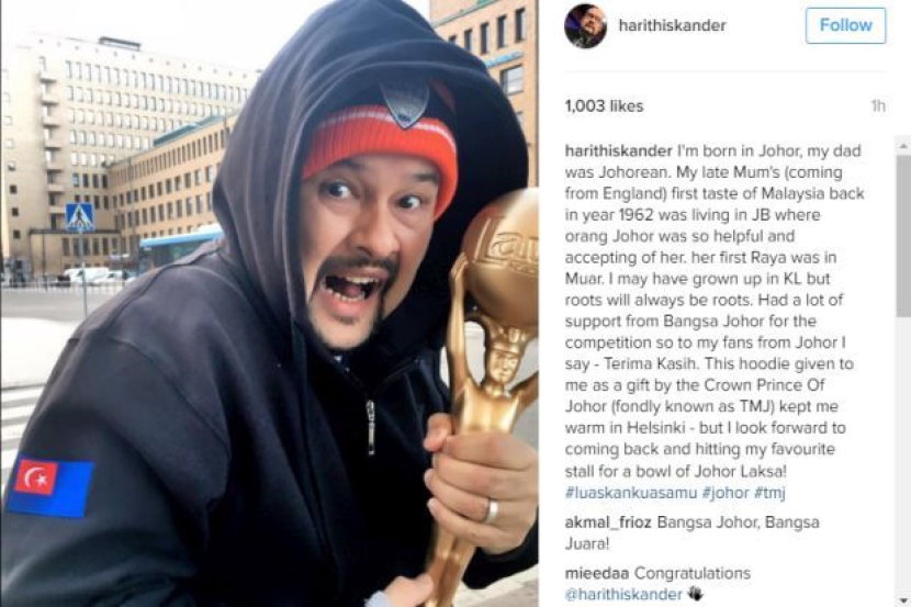 Beliau juga memuat naik gambarnya sedang memegang trofi dan memakai baju 'hoodie' berwarna biru gelap, dihiasi bendera Johor.