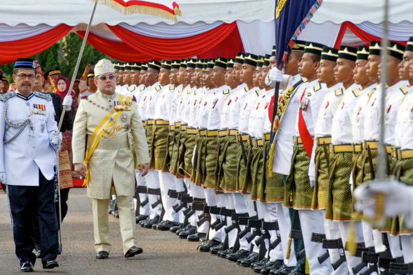 Sultan Kelantan Sultan Muhammad V memeriksa perbarisan kawalan kehormat dari Rejimen ke-5 Artileri Diraja Kem Desa Pahlawan pada Istiadat Keberangkatan Seri Paduka Baginda Yang Di-Pertuan Agong ke-15 di Istana Negeri Kubang Kerian, Selasa. Sultan Muhammad V akan diisytiharkan sebagai Yang di-Pertuan Agong ke-15 dalam satu istiadat mengikut tradisi Kesultanan Melayu yang akan berlangsung di Istana Negara, Selasa. -fotoBERNAMA